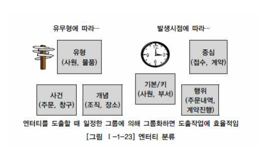 엔티티 자신의 성격에 의해 실체 유형에 따라 구분하거나, 업무를 구성하는 모습에 따라, 구분이 되는 발생시점에 따라 분류할 수 있음.