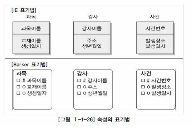 엔티티에는 두 개 이상의 인스턴스가 존재함. 각 엔티티는 고유의 성격을 표현하는 속성정보를 두개 이상 가짐. 각각의 인스턴스들은 어떤 성격의 데이터로 구성되는지를 파악하는 작업이 필요. 분석단계에서 여러개의 인스턴스가 가지는 동일한 성격은 무엇인지를 파악하고 이에 이름을 부여하여 속성으로 기술하는 작업이 필요. 예) 사원은 이름, 주소, 전화번호, 직책을 가짐. 사원이라는 엔티티에 속한 인스턴스들의 성격을 구체적으로 나타내는 항목이 바로 속성., 하나의 속성은 하나의 인스턴스에만 존재할 수 있음. 속성은 관계로 기술 될 수 없고, 자신이 속성을 가질 수 없음.