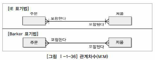 - 관계차수(Cardinality) : 1:1, 1:M, M:N