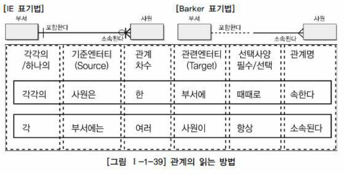데이터 모델을 읽는 방법은 먼저 고나계에 참여하는 기준 엔티티를 하나 또는 각각 읽고 대사 ㅇ엔티티의 개수(하나, 하나이상)를 읽고 관게선택사양과 관계명을 읽도록 함.