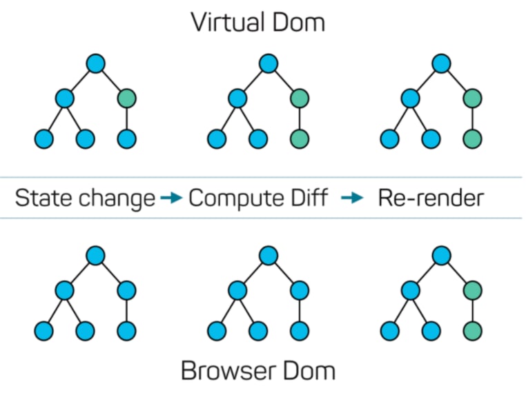2. 데이터 변경 전 이전 Virtual DOM과 변경 후 현재 Vitrual DOM의 차이를 계산해놓고 변경되어야할 때 작동한다. - 변경 탐지: 이전/현재 트리를 비교하는 diff 알고리즘 실행 (O(n) 복잡도 최적화)